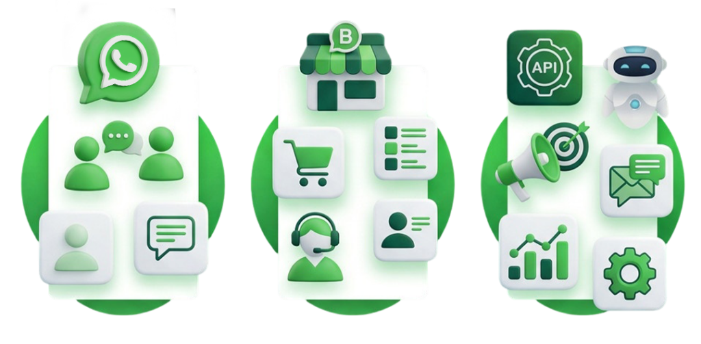 واتساب العادي مخصص للتواصل الشخصي، واتساب بزنس يوفر أدوات للشركات الصغيرة لإدارة الرسائل، بينما واتساب API يتيح للشركات الكبيرة إدارة التواصل على نطاق واسع مع أتمتة وربط الرسائل بأنظمة الأعمال المختلفة.